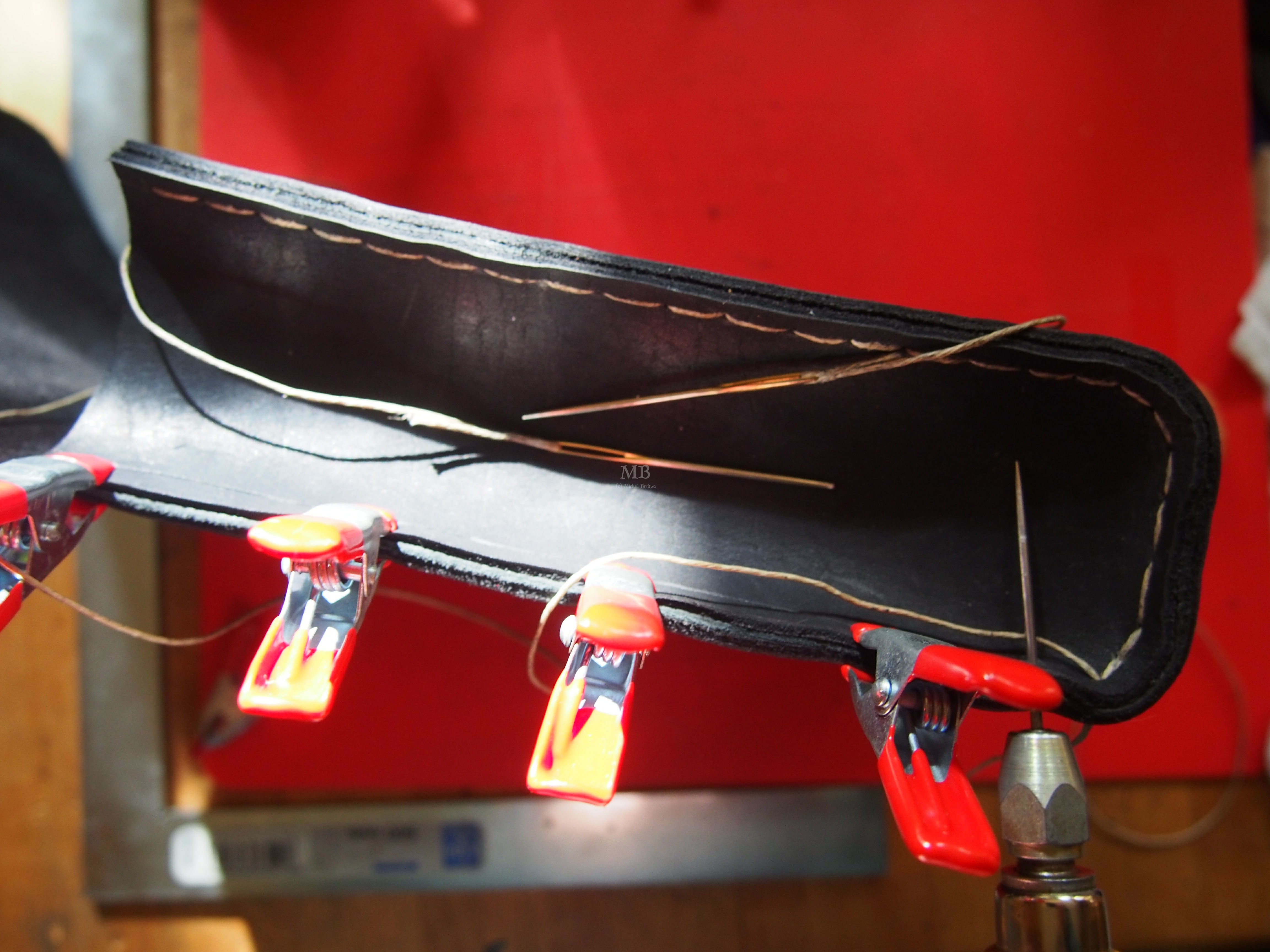 Passend zur Wagenfarbe wählte ich schwarz durchfärbtes vegetabiles Rind aus, etwa 2mm stark. Vernäht wieder nur mit 0,9mm starken Leinenzwirn natur. In die Lederstücke habe ich nach dem Zuschnitt mit dem Rillenzieher noch ein Rautenmuster geschnitten. Für die Klappspaten-Tasche besorgte ich mir noch ein aufnietbares Land Rover-Emblem. Insgesamt eine Griff-Ummantelung und 5 Taschen: für Handschuhe, den Bundeswehr-Klappspaten, das Camping-Beil und zwei Taschen für längliche Gegenstände.